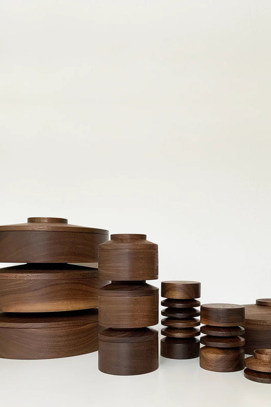 Net als de andere producten zijn deze voorraadpotten van donker notenhout met de hand vervaardigd. Het deksel kan ook als lekker bordje worden gebruikt. Repeat Stackable Little Storage Jars (set of 2)