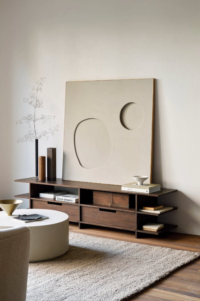 De Kabuki TV Meubel van Ethnicraft, ontworpen door de veelzijdige kunstenaar Reynaldo Zapp, brengt een perfect gevoel van balans en symmetrie in uw leefruimte en creëert een kalmerende sfeer. Gemaakt van duurzaam gelakt teakhout, voegt dit stuk niet alleen warmte en elegantie toe aan uw huis, maar is het ook gebouwd om lang mee te gaan.
