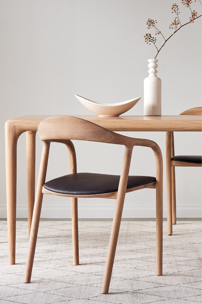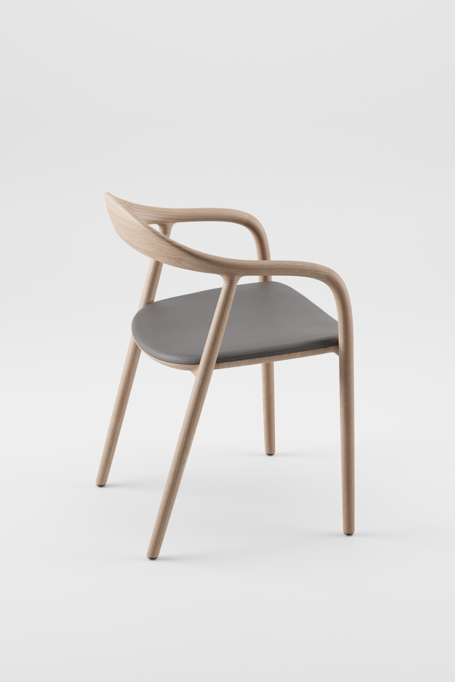 De Neva Eetkamerstoel Eiken met armleuning van Artisan, ontworpen door Regular Company, lijkt een sculptuur in de ruimte, waarvan de lineaire elementen pretentieloos fragmenten van de ruimte afbakenen. De zitting als basiselement is een oppervlak dat is gepositioneerd door middel van gestructureerde lijnen die in heldere, logische overgangen vloeien. De volumes en texturen van het massieve massief hout stralen zachtheid en aangenaam gebruik uit dankzij hun doordachte balans en fijn vakmanschap.