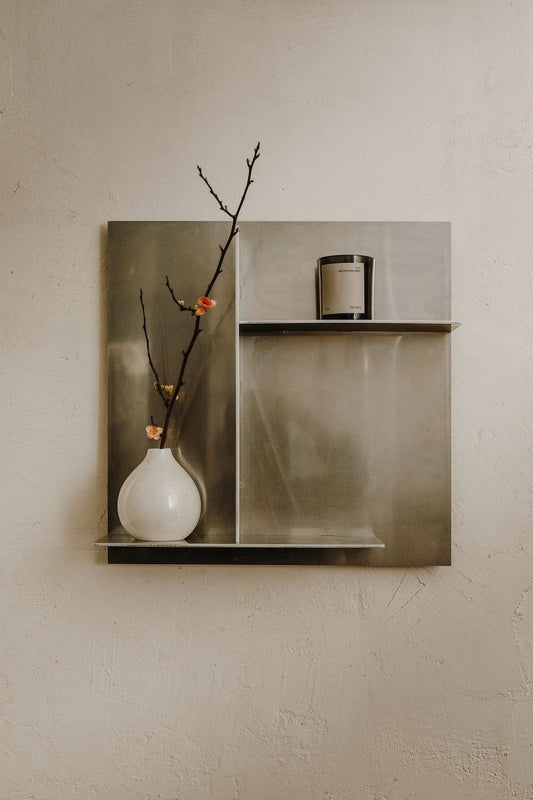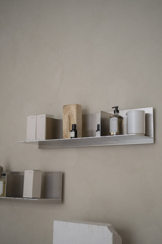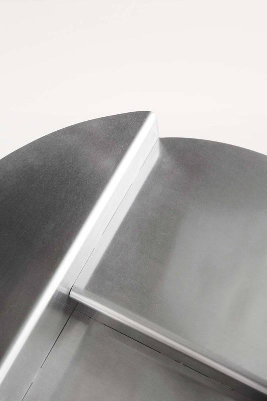 The Rivet Series distinguishes itself with sharp angles, round shapes, straight lines, and the prominent use of aluminum. Due to the difficulty of bending and screwing aluminum, an innovative application of the riveting technique was introduced. This involves joining aluminum plates with rivets, resulting not only in a robust construction but also in a visual aesthetic that deviates from the traditional. This experimental use of the riveting technique is clearly visible in the Rivet Side Table, where functionality and form converge, and the Rivet Shelf wall shelf, available in various sizes, offering a choice between small and large based on individual preference.