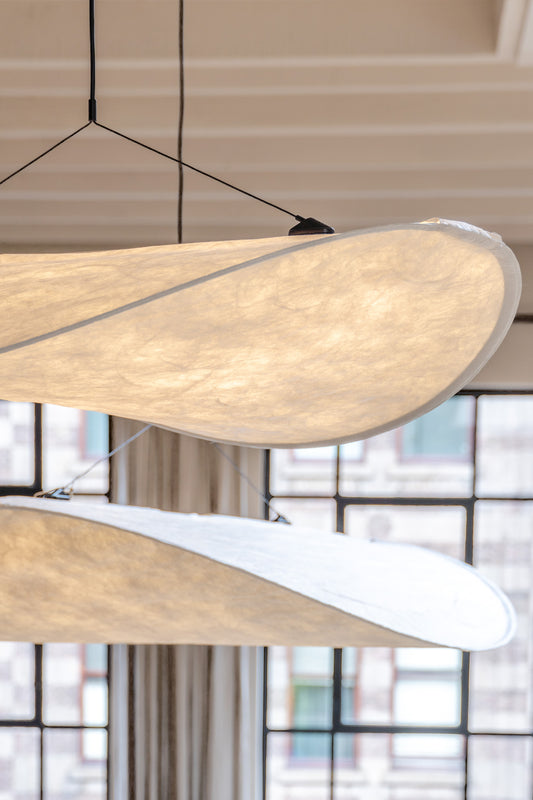 New Works utilizes a variety of materials, from timeless classics like marble and granite to innovative materials like Tyvek. An excellent example of the latter is the Tense Pendant Lamp, where functional Tyvek, a durable, lightweight, and 100% recyclable material typically used in insulation and medical equipment, is used in a completely new application.